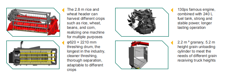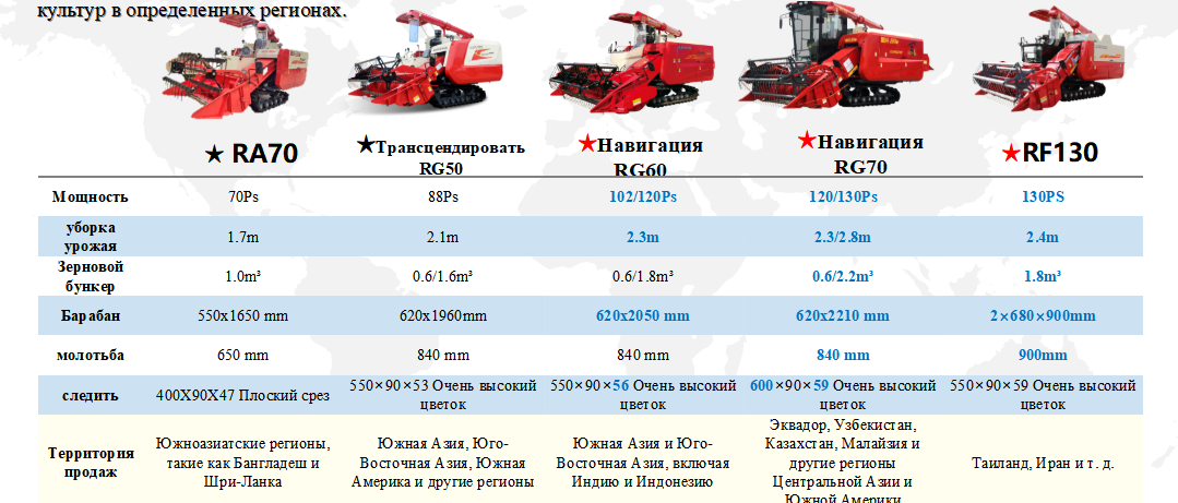 Для закордонних ринків ми представили чотири серії вертикальних осьових комбайнів: RA30, RG50, RG60 та RG70. Вони відрізняються високою взаємозамінністю компонентів і підходять для збирання врожаю на ширині від 1,5 до 2,8 метра. Одночасно ми розробили подвійну горизонтальну осьову модель RF130 для збирання важкообмолочуваних високорослих культур у певних регіонах.